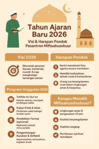 Assalamu’alaikum warahmatullahi wabarakatuh. Dengan penuh rasa syukur, Pondok Pesantren Miftaahush Shuduur menyambut Tahun Ajaran Baru 2026. Tahun ini menjadi momentum penting bagi keluarga besar pondok untuk terus menghadirkan pendidikan terbaik bagi santri—mulai dari pembinaan Al-Qur’an, adab, hingga penguatan karakter dan kreativitas di era modern. Visi Tahun Ajaran 2026 Mencetak generasi
